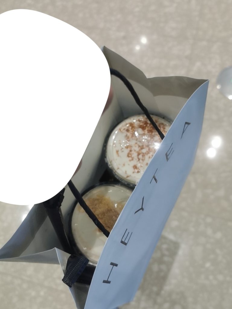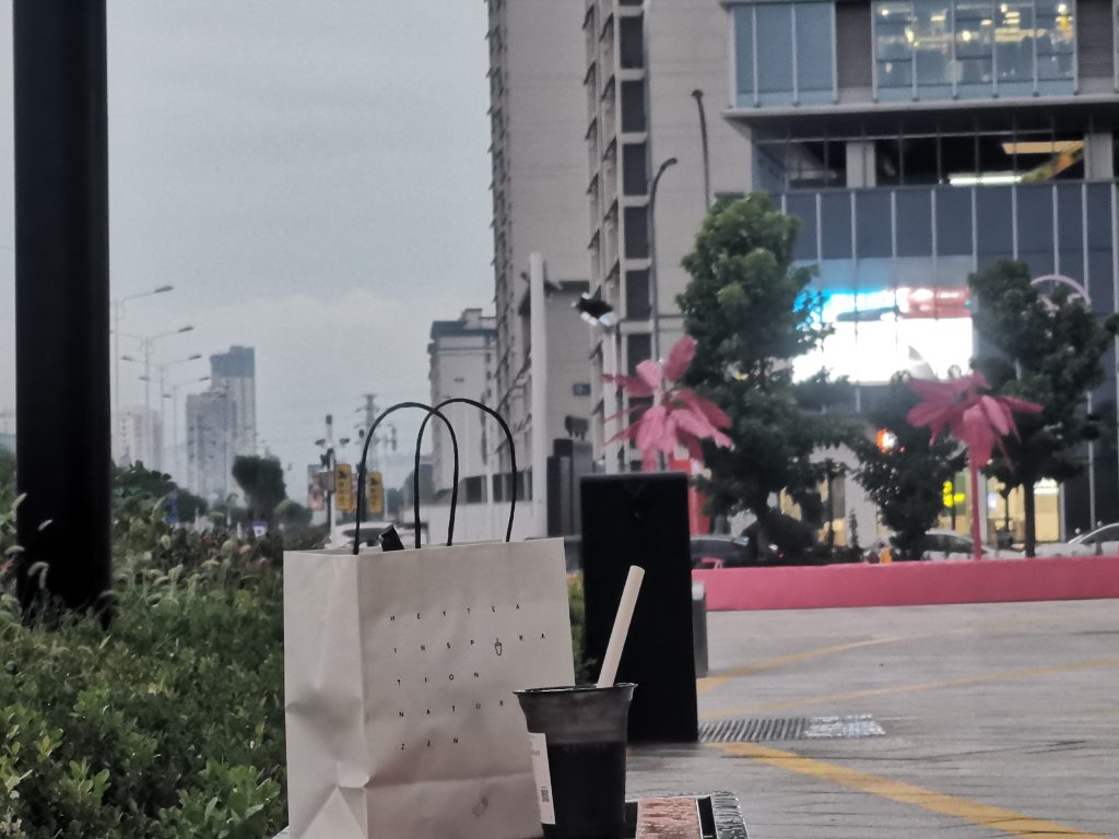在雨后的商场外的座椅,一个大学生干掉了两杯喜茶。